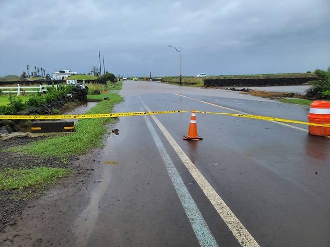 [제주=뉴시스] 양영전 기자 = 제14호 태풍 '찬투'가 제주와 가까워지고 있는 16일 오후 서귀포시 대정읍 상모리 인근 도로가 폭우로 인해 침수돼 있다. (사진=제주서부소방서 제공) 2021.09.16. photo@newsis.com