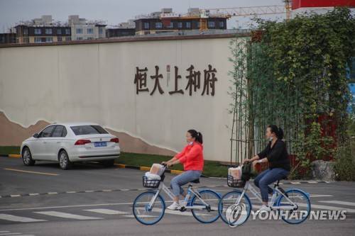 epa09471093 People ride bicycles past the Evergrande name seen near an Evergrande new housing development in Beijing, China, 16 September 2021. Chinese property developer Evergrande said on 14 September that its property sales will likely continue to drop significantly in September, resulting in a further deterioration of its cash situation, according to media reports. EPA/WU HONG