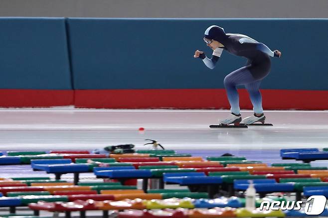 (서울=뉴스1) 안은나 기자 = 16일 서울 노원구 태릉국제스케이트장에서 열린 SK텔레콤배 제56회 전국남녀 종목별 스피드스케이팅 선수권대회 여자 3000m 결승에서 김보름(강원도청)이 역주하고 있다. 김보름은 4분19초44로 1위를 기록했다. 2021.9.16/뉴스1