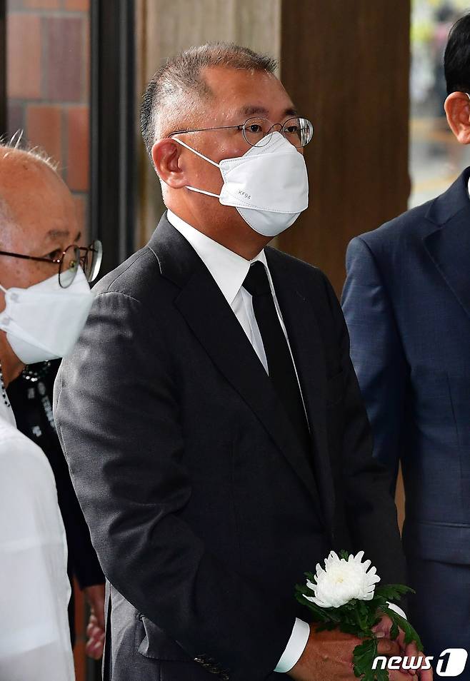 (서울=뉴스1) = 정의선 현대자동차 회장이 16일 서울 여의도순복음교회 대성전 1층 베다니홀에 마련된 고 조용기 원로목사의 빈소에서 조문하고 있다. (국민일보 제공) 2021.9.16/뉴스1