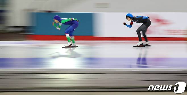 (서울=뉴스1) 안은나 기자 = 16일 서울 노원구 태릉국제스케이트장에서 열린 SK텔레콤배 제56회 전국남녀 종목별 스피드스케이팅 선수권대회 여자 3000m 결승에서 김민서(평촌고, 왼쪽)와 박채원(한국체대)이 역주하고 있다. 2021.9.16/뉴스1