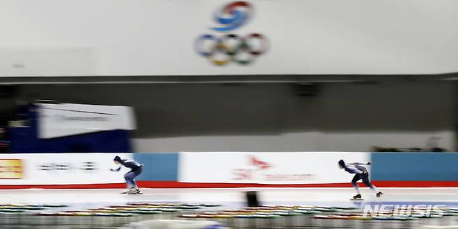 [서울=뉴시스] 홍효식 기자 = 16일 오후 서울 노원구 태릉 국제스케이트장에서 열린 SK텔레콤배 제56회 전국남녀 스피드 스케이팅 선수권대회, 여자부 3000M 결승에서 김보름(강원도청, 왼쪽)과 박지우(강원도청)가 질주하고 있다. 2021.09.16. yesphoto@newsis.com