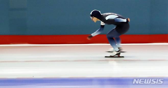 [서울=뉴시스] 홍효식 기자 = 16일 오후 서울 노원구 태릉 국제스케이트장에서 열린 SK텔레콤배 제56회 전국남녀 스피드 스케이팅 선수권대회, 여자부 3000M 결승에서 김보름(강원도청)이 질주하고 있다. 2021.09.16. yesphoto@newsis.com