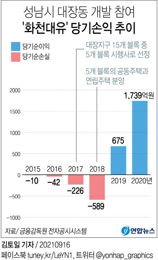 금융감독원 전자공시시스템을 보면 화천대유의 지난해 당기순이익은 1739억원, 2019년은 675억원이다. 지난해 분양매출이익은 1530억원, 2019년은 822억원이다. 주택 분양 이전인 2015~2018년 총 867억원의 적자를 냈지만, 분양 이후 2년간 2414억원의 흑자를 내 6년간 1547억원의 이득을 본 것으로 분석됐다.