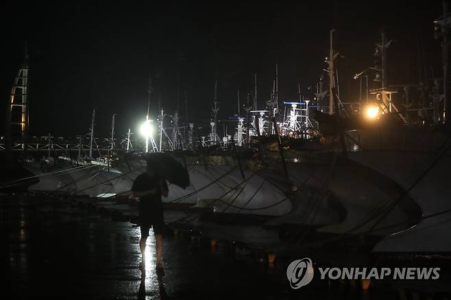 (서귀포=연합뉴스) 박지호 기자 = 제주도에 태풍경보가 내려진 16일 밤 서귀포항에 대피한 어선들 일부가 불을 환히 밝히고 있다. 2021.9.16