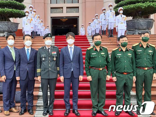 (서울=뉴스1) = 16일 베트남을 방문한 박재민 국방부 차관(왼쪽에서 네번째)이 호앙 쑤안 찌엔(Hoang Xuan Chien) 베트남 국방부 차관을 비롯한 관계자들과 함께 한-베트남 국방전략대화에 앞서 기념촬영을 하고 있다. (국방부 제공) 2021.9.16/뉴스1