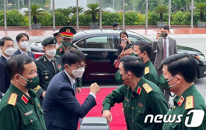 (서울=뉴스1) = 16일 베트남을 방문한 박재민 국방부 차관이 호앙 쑤안 찌엔(Hoang Xuan Chien) 베트남 국방부 차관과 한-베트남 국방전략대화에 앞서 인사를 나누고 있다. (국방부 제공) 2021.9.16/뉴스1