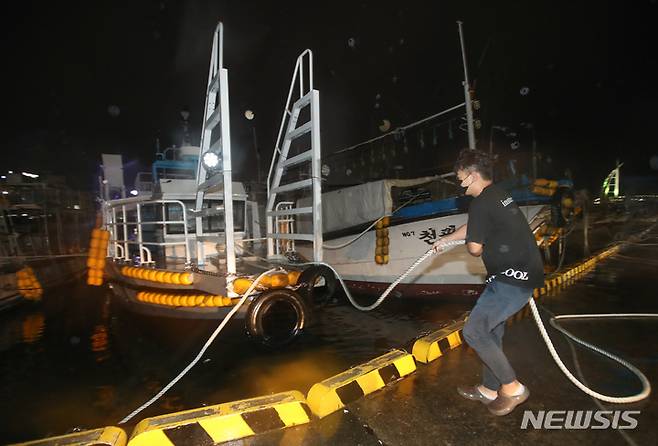[서귀포=뉴시스] 우장호 기자 = 제14호 태풍 '찬투(CHANTHU)'가 북상 중인 16일 오후 제주 서귀포항에서 한 선주가 선박 결속 상태를 점검하고 있다. 기상청은 태풍이 17일 오전 6시 서귀포 남남동쪽 약 50㎞ 해상까지 진출하겠다고 예보했다. 2021.09.16. woo1223@newsis.com