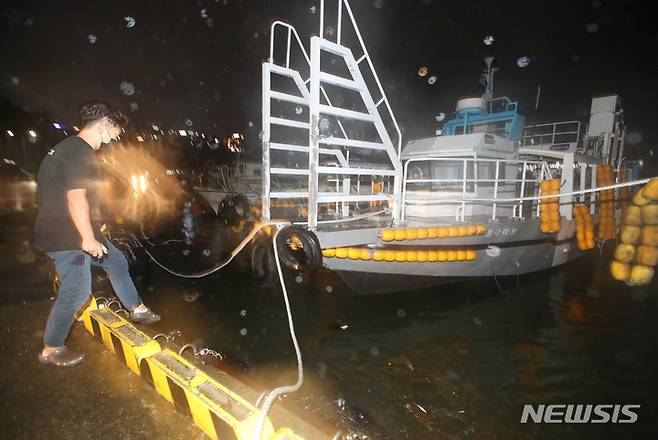 [서귀포=뉴시스] 우장호 기자 = 제14호 태풍 '찬투(CHANTHU)'가 북상 중인 16일 오후 제주 서귀포항에서 한 선주가 선박 결속 상태를 점검하고 있다. 기상청은 태풍이 17일 오전 6시 서귀포 남남동쪽 약 50㎞ 해상까지 진출하겠다고 예보했다. 2021.09.16. woo1223@newsis.com
