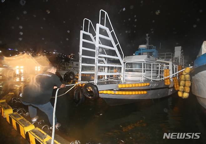 [서귀포=뉴시스] 우장호 기자 = 제14호 태풍 '찬투(CHANTHU)'가 북상 중인 16일 오후 제주 서귀포항에서 한 선주가 선박 결속 상태를 점검하고 있다. 기상청은 태풍이 17일 오전 6시 서귀포 남남동쪽 약 50㎞ 해상까지 진출하겠다고 예보했다. 2021.09.16. woo1223@newsis.com