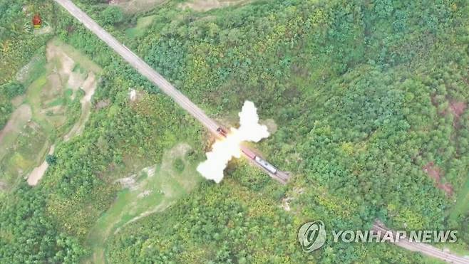 (서울=연합뉴스) 북한은 "철도기동미사일연대는 9월 15일 새벽 중부산악지대로 기동해 800km 계선의 표적지역을 타격할 데 대한 임무를 받고 훈련에 참가했다"며 "철도미사일체계운영규범과 행동순차에 따라 신속기동 및 전개를 끝내고 조선동해상 800㎞ 수역에 설정된 표적을 정확히 타격했다"고 조선중앙TV가 16일 보도했다.