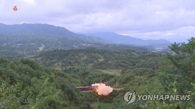 (서울=연합뉴스) 북한은 "철도기동미사일연대는 9월 15일 새벽 중부산악지대로 기동해 800km 계선의 표적지역을 타격할 데 대한 임무를 받고 훈련에 참가했다"며 "철도미사일체계운영규범과 행동순차에 따라 신속기동 및 전개를 끝내고 조선동해상 800㎞ 수역에 설정된 표적을 정확히 타격했다"고 조선중앙TV가 16일 보도했다.