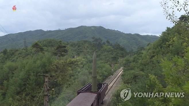 (서울=연합뉴스) 북한은 "철도기동미사일연대는 9월 15일 새벽 중부산악지대로 기동해 800km 계선의 표적지역을 타격할 데 대한 임무를 받고 훈련에 참가했다"며 "철도미사일체계운영규범과 행동순차에 따라 신속기동 및 전개를 끝내고 조선동해상 800㎞ 수역에 설정된 표적을 정확히 타격했다"고 조선중앙TV가 16일 보도했다.