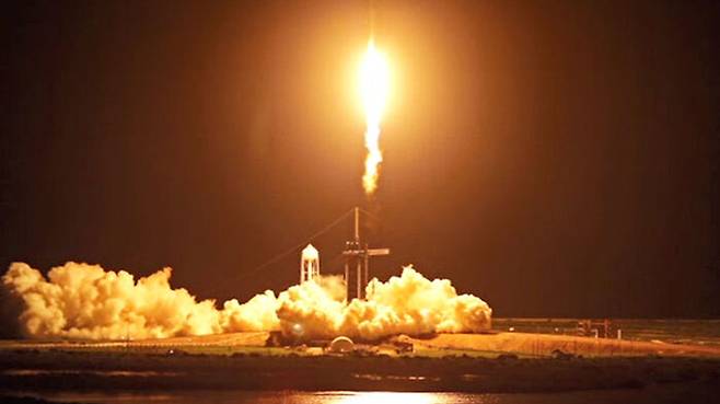 스페이스X사의 우주선 '크루드래건'이 어둠을 뚫고 하늘로 올라갑니다.
