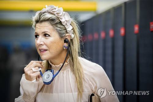epa09471267 Dutch Queen Maxima listens to explanations on a pair of earphones as she looks at the new national supercomputer 'Snellius' which she launched at the Science Park in Amsterdam, The Netherlands, 16 September 16, 2021. The new computer offers scientific research in the Netherlands ten times as much computing power as its predecessor. Snellius will be located in the Amsterdam Data Tower. EPA/PATRICK VAN KATWIJK / POOL