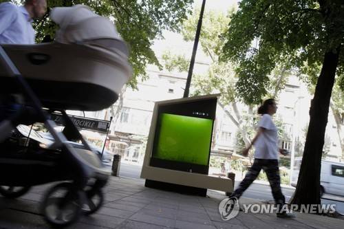 epa09471322 People walk past a ?Liquid3? urban photo-bioreactor developed and designed by the University of Belgrade Institute for Multidisciplinary Research in Belgrade, Serbia, 16 September 2021. An urban photo-bioreactor uses the power of micro algae to efficiently remove carbon dioxide (CO2) and produces dioxygen (O2) and biomass, effectively replacing one adult tree or 200 square meters of lawn, representing an alternative sustainable concept of greening of urban environments that show limited space and heavy pollution. EPA/ANDREJ CUKIC
