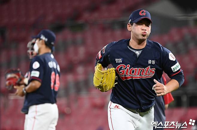 (엑스포츠뉴스 수원, 박지영 기자) 16일 오후 수원케이티위즈파크에서 열린 '2021 신한은행 SOL KBO리그' 롯데 자이언츠와 KT 위즈의 경기, 7회말 2사 2,3루 롯데 김진욱이 강판되어 마운드를 내려가고 있다.