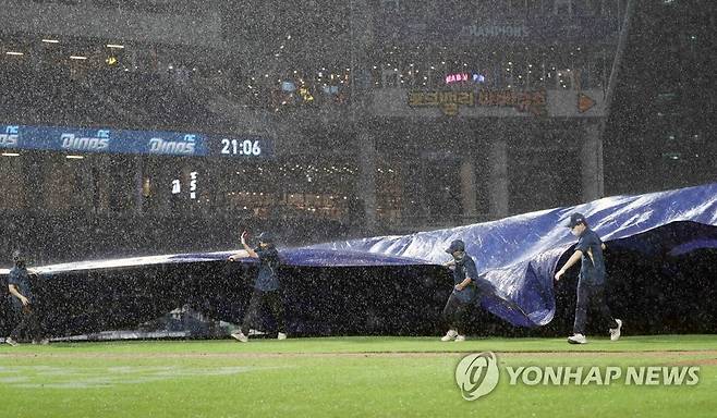 (창원=연합뉴스) 김동민 기자 = 16일 창원NC파크에서 열린 2021 KBO 프로야구 NC 다이노스와 LG 트윈스 경기. 8회 초 폭우가 내리자 구단 관계자가 방수포를 덮고 있다. 2021.9.16