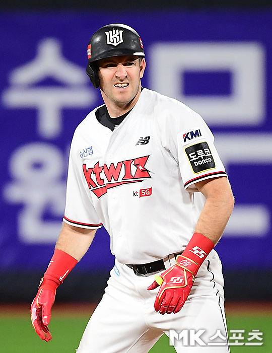 7회말 2사 1, 2루에서 kt 호잉이 1타점 2루타를 치고 진루하고 있다.