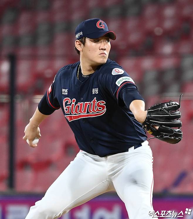 (엑스포츠뉴스 수원, 박지영 기자) 16일 오후 수원케이티위즈파크에서 열린 '2021 신한은행 SOL KBO리그' 롯데 자이언츠와 KT 위즈의 경기, 7회말 2사 2,3루 롯데 김도규가 역투하고 있다.