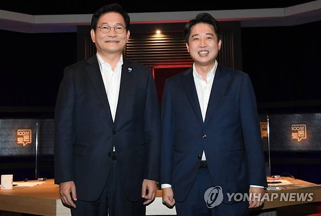 (서울=연합뉴스) 더불어민주당 송영길 대표(왼쪽)와 국민의힘 이준석 대표가 16일 오후 서울 상암동 MBC에서 열린 100분 토론 '추석특집 여야 당대표 토론, 민심을 읽다'에서 기념촬영을 하고 있다. 2021.9.16 [국회사진기자단]