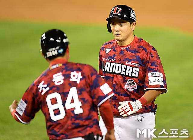 9회초 SSG 선두타자 최주환이 안타를 친 뒤 조동화 코치와 하이파이브 하고 있다.