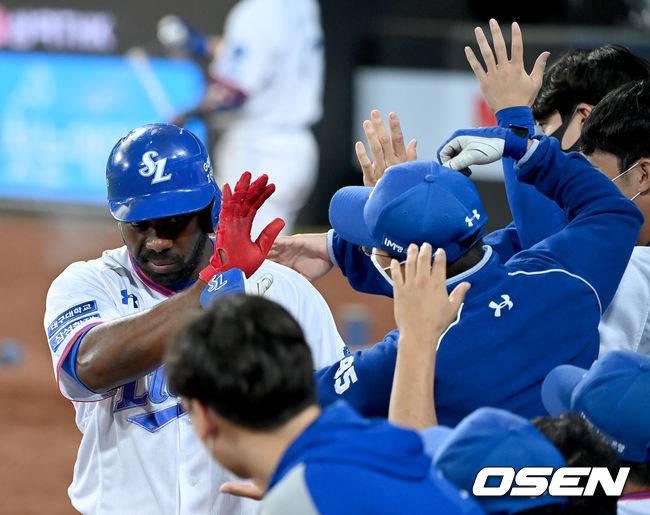 8회말 1사 삼성 피렐라가 솔로 홈런을 날린 뒤 더그아웃에서 동료 선수들과 기쁨을 나누고 있다. 2021.09.16 /ksl0919@osen.co.kr