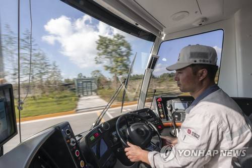 epa09471342 A man drives SRT vehicle in a SRRC factory during the organised media tour in Yancheng, Jiangsu province, China, 16 September 2021. SRRC is leading supplier of rail transit equipment in China. SRT, super autonomous rail rapid transit, is the firm's latest product using a virtual ground railway guided by Beidou satellite and designed for public transportation. EPA/ALEX PLAVEVSKI