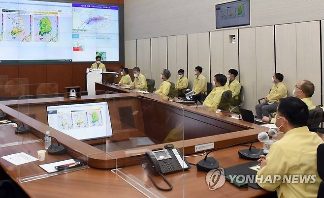 (서울=연합뉴스) 이승우 행정안전부 재난안전관리본부장이 정부세종2청사 중앙재난안전대책본부 상황실에서 기상청 등 관계자들과 제14호 태풍 찬투 대비 지자체 대응 준비 상황을 점검하고 있다. 2021.9.16 [행정안전부 제공. DB 및 재판매 금지]