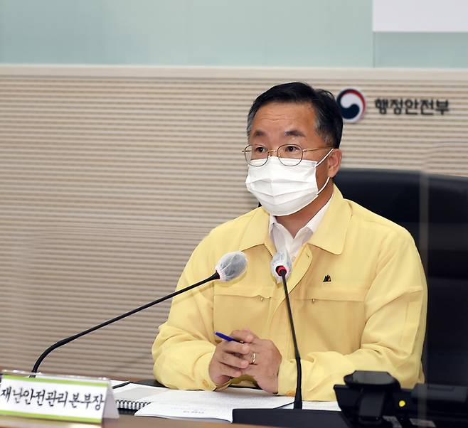 [서울=뉴시스] 고범준 기자 = 이승우 행정안전부 재난안전관리본부장이16일 저녁 정부세종2청사 중앙재난안전대책본부 상황실에서 기상청 등 관계자들과 제14호 태풍 찬투 대비를 위해 지자체 현장대응 실태 등을 긴급 점검하고 있다. (사진=행정안전부 제공) 2021.09.16. photo@newsis.com *재판매 및 DB 금지