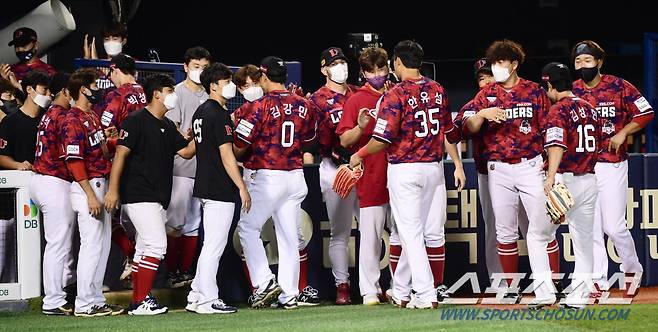 2021 KBO리그 두산베어스와 SSG랜더스의 경기가 16일 서울잠실야구장에서 열렸다. SSG 선수들이 두산 상대 3대3 무승부를 확정짓고 하이파이브 하고 있다. 잠실 =최문영 기자 deer@sportschosun.com /2021.09.16/