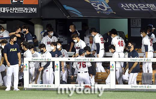 [마이데일리 = 유진형 기자] 두산이 16일 오후 서울 잠실야구장에서 진행된 '2021 신한은행 SOL KBO리그' 두산 베어스와 SSG 랜더스의 경기에서 3-3으로 무승부를 기록한 뒤 아쉬워하고 있다.