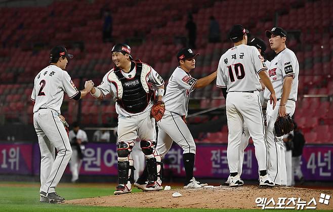 경기 종료 후 KT 선수들이 승리의 기쁨을 나누고 있다.