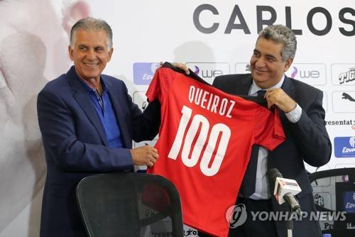 epa09471392 Carlos Queiroz, the new head coach of the Egyptian national soccer team, poses with president of the Egyptian football federation Ahmed Megahed (R) during his presentation at a news conference in Cairo, Egypt, 16 September 2021. EPA/KHALED ELFIQI