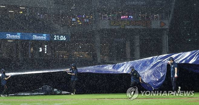 (창원=연합뉴스) 김동민 기자 = 16일 창원NC파크에서 열린 2021 KBO 프로야구 NC 다이노스와 LG 트윈스 경기. 8회 초 폭우가 내리자 구단 관계자가 방수포를 덮고 있다. 2021.9.16