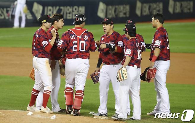 (서울=뉴스1) 박지혜 기자 = 16일 서울 잠실야구장에서 열린 2021 프로야구 신한은행 SOL KBO리그 두산 베어스와 SSG 랜더스의 경기에서 SSG 선수들이 치열한 접전 끝에 무승부로 경기를 끝낸 뒤 서로 격려하고 있다. 2021.9.16/뉴스1