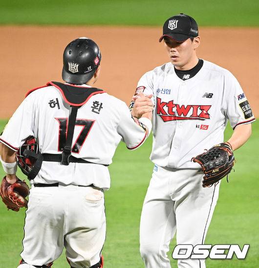 경기종료 후 허도환 포수와 김재윤 마무리 투수가 하이파이브를 하고 있다. 2021.09.16 / soul1014@osen.co.kr