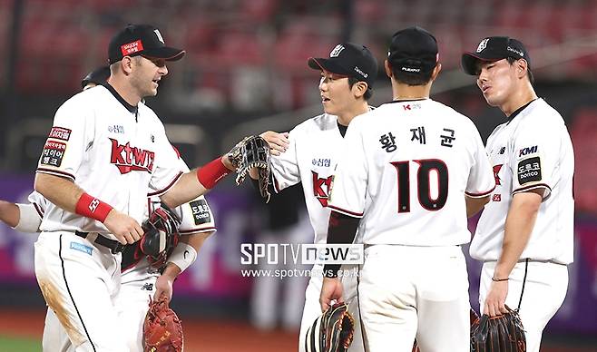 [스포티비뉴스=수원, 곽혜미 기자] 2021 신한은행 SOL KBO리그 KT 위즈와 롯데 자이언츠의 경기가 16일 오후 수원 KT위즈파크에서 열렸다. 7-4로 승리한 KT 선수들이 하이파이브를 하고 있다.