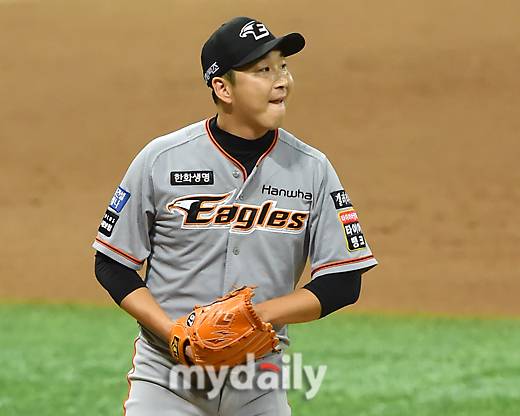 [마이데일리 = 한혁승 기자] 한화 정우람이 16일 오후 서울 고척동 스카이돔에서 열린 2021 KBO리그 한화-키움 경기 9회말 2사 1-2루에 키움 김웅빈에게 동점 2타점 적시 2루타를 맞았다. 경기는 결국 8-8 무승부를 기록했다.- ⓒ마이데일리(www.mydaily.co.kr). 무단전재&재배포 금지 -