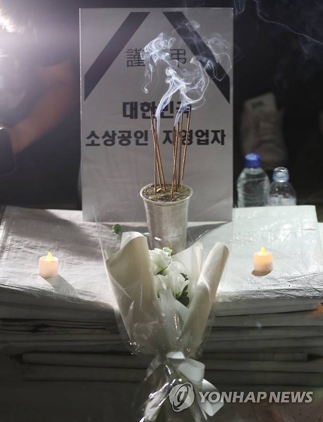 (서울=연합뉴스) 박동주 기자 = 16일 오후 여의도 국회의사당역 3번 출구 앞에 최근 생활고에 시달리다 세상을 떠난 자영업자들을 추모하고 정부에 영업제한조치 철폐를 촉구하는 분향소가 설치되어 있다. 이날 전국자영업비상대책위원회는 분향소 설치를 놓고 경찰이 방역법 위반과 도로점유에 관한 법률 위반 등을 이유로 막자 1인 분향을 제안하며 분향소 설치를 요구했다. 2021.9.16