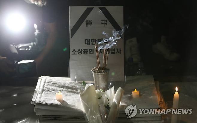 (서울=연합뉴스) 박동주 기자 = 16일 오후 여의도 국회의사당역 3번 출구 앞에 최근 생활고에 시달리다 세상을 떠난 자영업자들을 추모하고 정부에 영업제한조치 철폐를 촉구하는 분향소가 설치되어 있다. 이날 전국자영업비상대책위원회는 분향소 설치를 놓고 경찰이 방역법 위반과 도로점유에 관한 법률 위반 등을 이유로 막자 1인 분향을 제안하며 분향소 설치를 요구했다. 2021.9.16