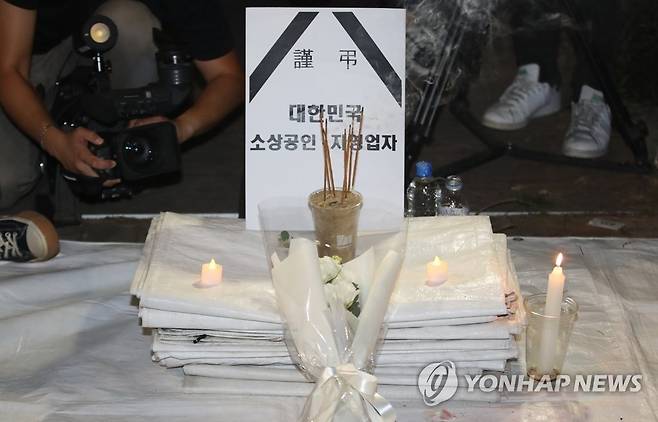 (서울=연합뉴스) 박동주 기자 = 16일 오후 여의도 국회의사당역 3번 출구 앞에 최근 생활고에 시달리다 세상을 떠난 자영업자들을 추모하고 정부에 영업제한조치 철폐를 촉구하는 분향소가 설치되어 있다. 이날 전국자영업비상대책위원회는 분향소 설치를 놓고 경찰이 방역법 위반과 도로점유에 관한 법률 위반 등을 이유로 막자 1인 분향을 제안하며 분향소 설치를 요구했다. 2021.9.16
