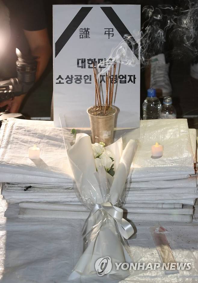 (서울=연합뉴스) 박동주 기자 = 16일 오후 여의도 국회의사당역 3번 출구 앞에 최근 생활고에 시달리다 세상을 떠난 자영업자들을 추모하고 정부에 영업제한조치 철폐를 촉구하는 분향소가 설치되어 있다. 이날 전국자영업비상대책위원회는 분향소 설치를 놓고 경찰이 방역법 위반과 도로점유에 관한 법률 위반 등을 이유로 막자 1인 분향을 제안하며 분향소 설치를 요구했다. 2021.9.16