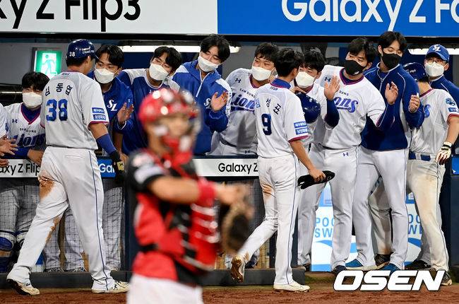 9회말 2사 2, 3루 삼성 김호재의 2타점 적시 2루타 때 주자 김동엽, 김성표가 득점을 올린 뒤 더그아웃에서 동료 선수들과 기쁨을 나누고 있다. 2021.09.16 /ksl0919@osen.co.kr