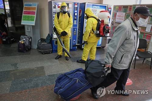 epa09471445 Russian Emergency Situations Ministry workers preparing to sanitise Belorussky railway station as part of the campaign to prevent the spread of the SARS-CoV-2 coronavirus which causes the COVID-19 disease in Moscow, Russia, 16 September 2021. Over the past 24 hours, 2479 cases of COVID-19 coronavirus infection have been detected in Moscow. EPA/MAXIM SHIPENKOV