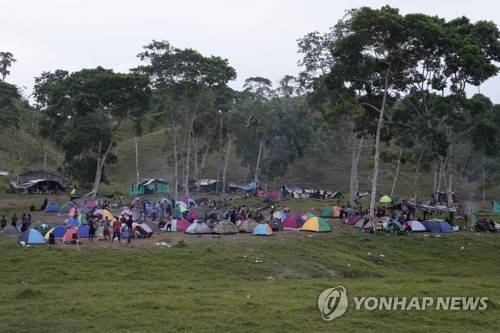 Migrants camp on a field in Acandi, Colombia, Tuesday, Sept. 14, 2021. The migrants, following a well-beaten, multi-nation journey towards the U.S., will continue their journey through the jungle known as the Darien Gap. (AP Photo/Fernando Vergara)