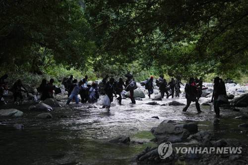 Migrants cross the Acandi River as they continue on their trek north, in Acandi, Colombia, Wednesday, Sept. 15, 2021. The migrants, following a well-beaten, multi-nation journey towards the U.S., will continue their journey through the jungle known as the Darien Gap. (AP Photo/Fernando Vergara)