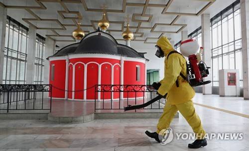 epa09471447 A Russian Emergency Situations Ministry worker sanitises Belorussky railway station as part of the campaign to prevent the spread of the SARS-CoV-2 coronavirus which causes the COVID-19 disease in Moscow, Russia, 16 September 2021. Over the past 24 hours, 2479 cases of COVID-19 coronavirus infection have been detected in Moscow. EPA/MAXIM SHIPENKOV
