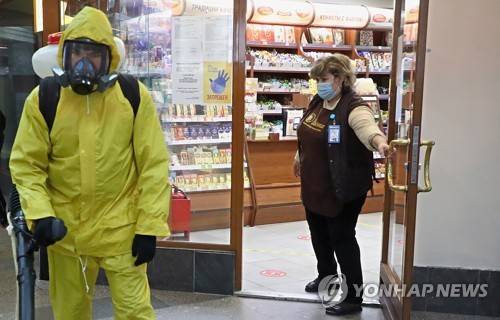 epa09471450 A Russian Emergency Situations Ministry worker sanitises Belorussky railway station as part of the campaign to prevent the spread of the SARS-CoV-2 coronavirus which causes the COVID-19 disease in Moscow, Russia, 16 September 2021. Over the past 24 hours, 2479 cases of COVID-19 coronavirus infection have been detected in Moscow. EPA/MAXIM SHIPENKOV