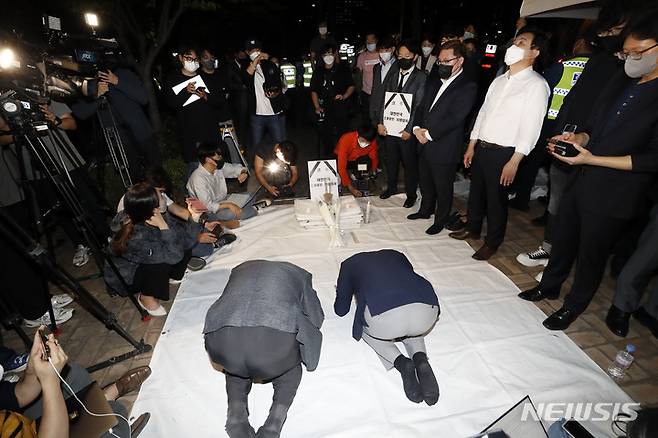 [서울=뉴시스] 홍효식 기자 = 코로나19 경영난으로 극단적인 선택을 한 자영업자들을 기리기 위한 합동분향소 설치가 경찰 제지로 무산돼 임시 분향소 자리가 마련된 16일 오후 서울 영등포구 여의도 국회 앞에서 자영업자들이 추모하고 있다. 2021.09.16. yesphoto@newsis.com